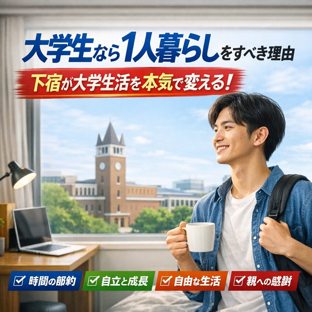 大学生が1人暮らし(下宿)をするメリットを実体験ベースで解説。通学時間の削減、自由時間の増加、自立の重要性まで網羅。本気で大学生活を充実させたい人向けの記事です。
