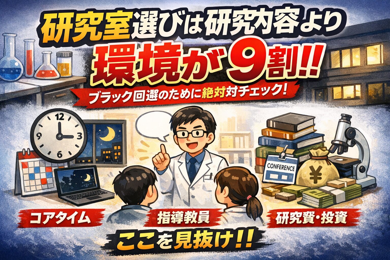 コアタイム、指導教員の教える意欲、学生への投資。まずはここで研究室をふるいにかけてください。